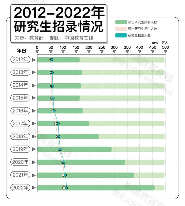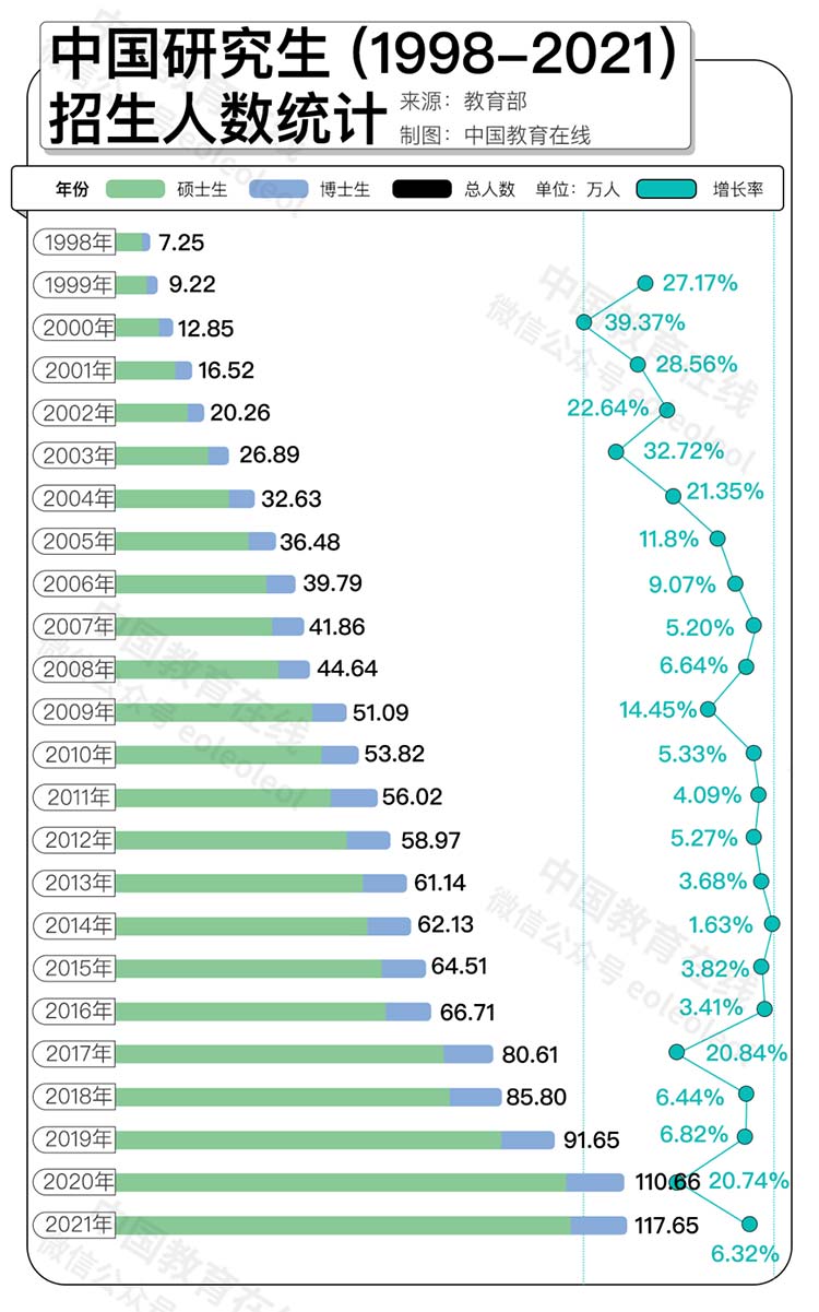进入21世纪以来,我国研究生每年招生人数飞速增长。根据教育部公布的数据,21世纪第一个10年,我国研究生招生规模从2001年的15.9万,增长到2010年的47.20万,增长了三倍多;第二个10年,研究生招生人数再翻一番。