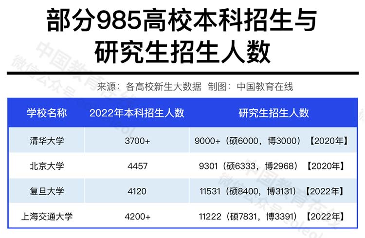 清华大学2022年本科招生3700余人,研究生招生逾9000人。2022年,复旦大学招收各类新生15651人,是80年代的十余倍,其中本科生4120人,占比26%,硕士8400人,占比54%,博士3131人,占比20%。上海交大类似,硕博研究生招生10800人,合计占比72%。华中科大、吉林大学、中山大学研究生招生人数也都超万人。