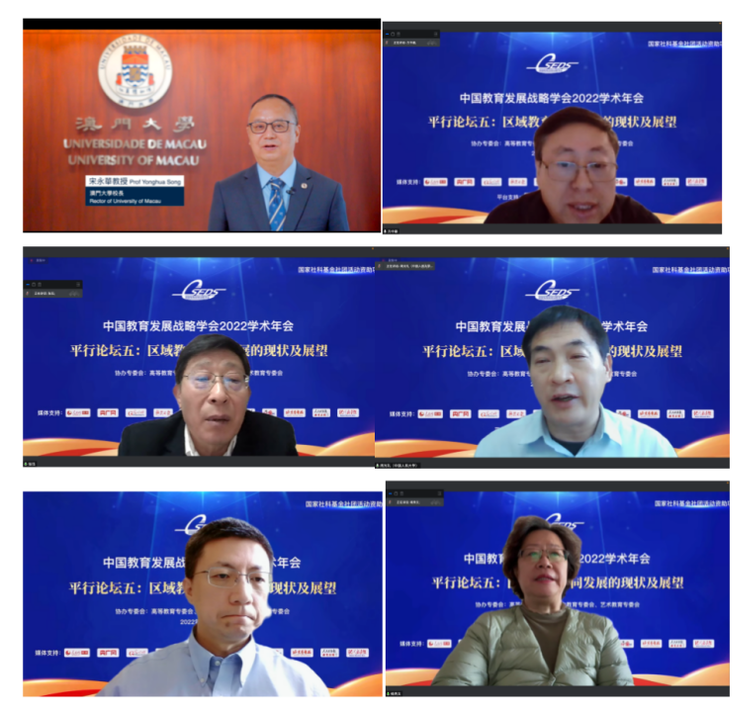 随后,主题报告开始。主题报告环节由中国教育发展战略学会艺术教育专委会秘书长、原国家教育发展研究中心政策评估部副主任杨秀文主持。中国教育发展战略学会副会长兼国际教育专委会理事长、澳门大学校长宋永华围绕“粤港澳大湾区建设与高等教育合作发展”主题阐释了一流高校通过区域合作来提升整体竞争力、促进区域教育协同发展的世界经验。宋永华指出,区域合作是高等教育未来发展的必由之路,二十大报告首次将教育、科技、人才作为决胜现代化建设全局的基础性、战略性支撑,同时强调要促进区域协调发展,推进粤港澳大湾区建设。粤港澳大湾区正处于国家“双循环”的重要交汇点,粤港澳湾区高等教育的未来应该重点关注科技、人才、创新,积极推动区域合作与区域协调发展,充分发挥港澳的桥梁作用,助力对外开放。宋永华同时表示,澳门大学将积极服务国家区域发展战略与对外开放战略,推动区域教育高质量发展。