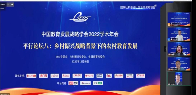中国教育发展战略学会2022年学术年会——乡村振兴战略背景下的农村教育发展分论坛于12月18日在线上开幕。本次会议以“学习贯彻二十大精神,深入探讨乡村振兴背景下的农村教育发展”为主题。聚焦多产业合作,打开思路,开拓新的教育模式,建立多点共建的发展战略,推动乡村教育的进一步深入。
