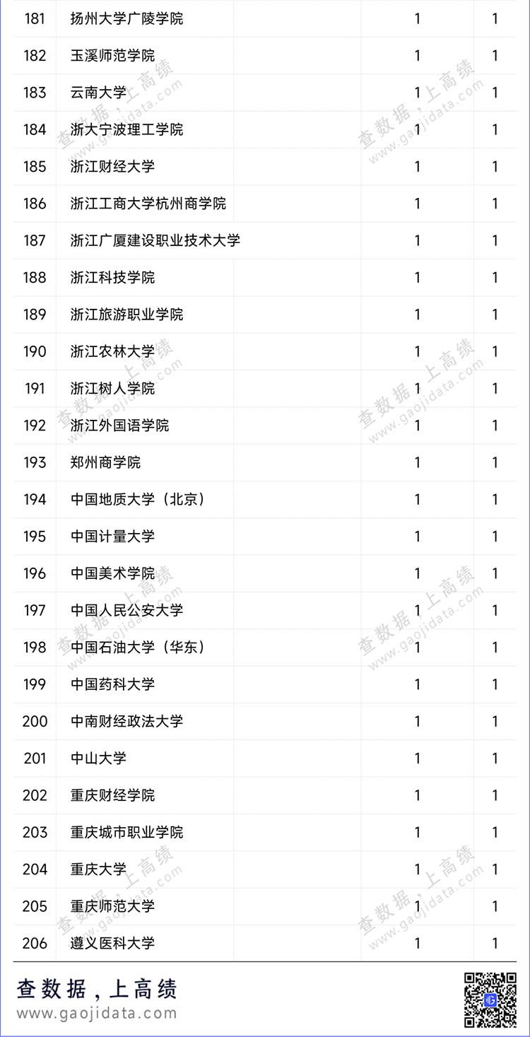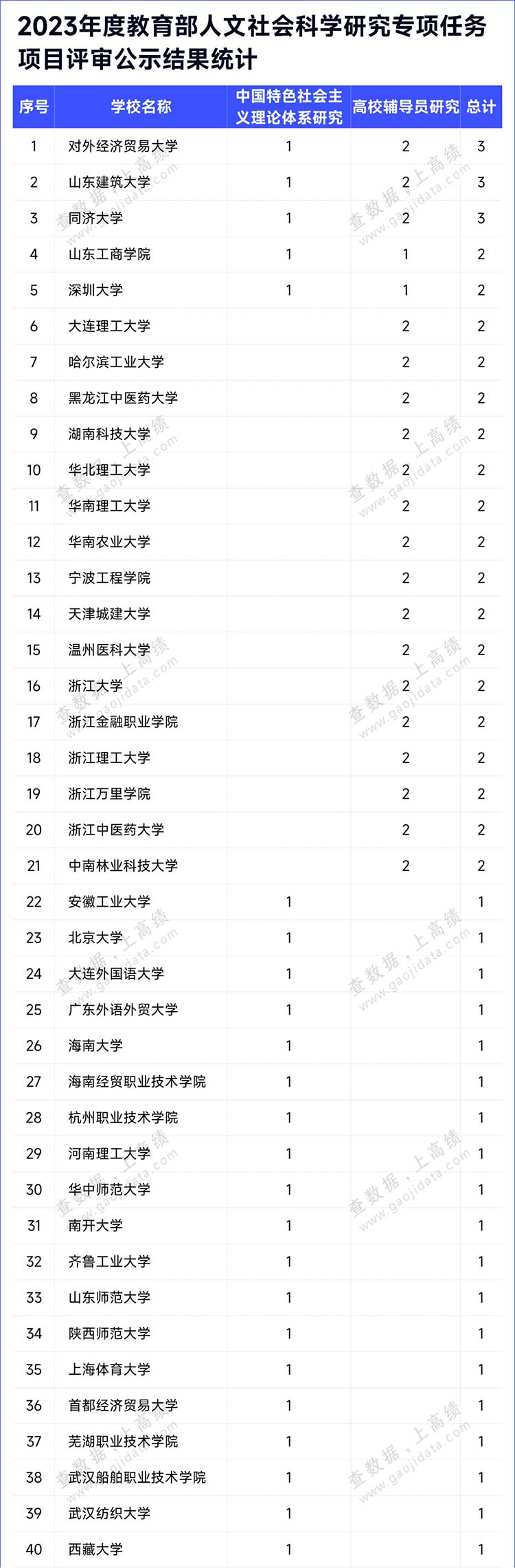 2023年度教育部人文社会科学研究专项任务项目中,对外经济贸易大学、山东建筑大学和同济大学各入选3项;山东工商学院、深圳大学、大连理工大学等18所高校各入选2项;其余各高校各入选1项。