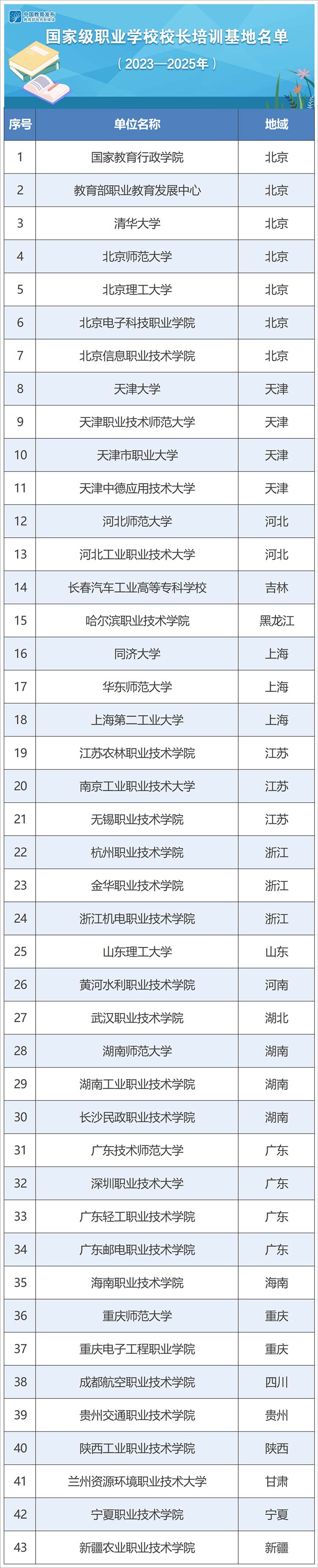 近日,教育部印发通知,遴选确定43个基地为2023—2025年国家级职业学校校长培训基地。