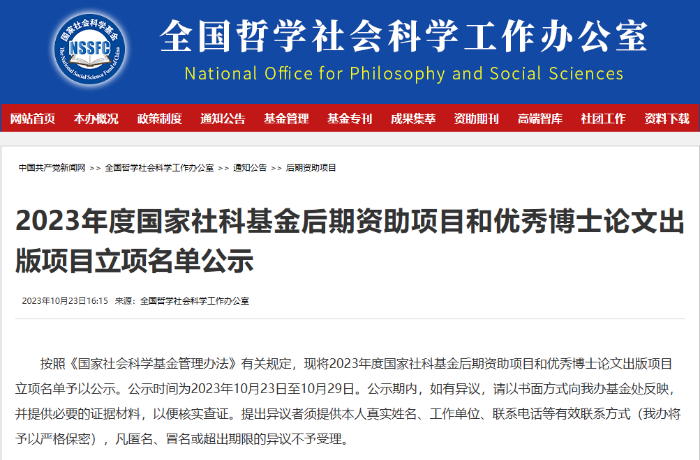 10月23日,全国哲学社会科学工作办公室发布《2023年度国家社科基金后期资助暨优秀博士论文出版项目立项名单公示》,公示时间为2023年10月23日至10月29日。