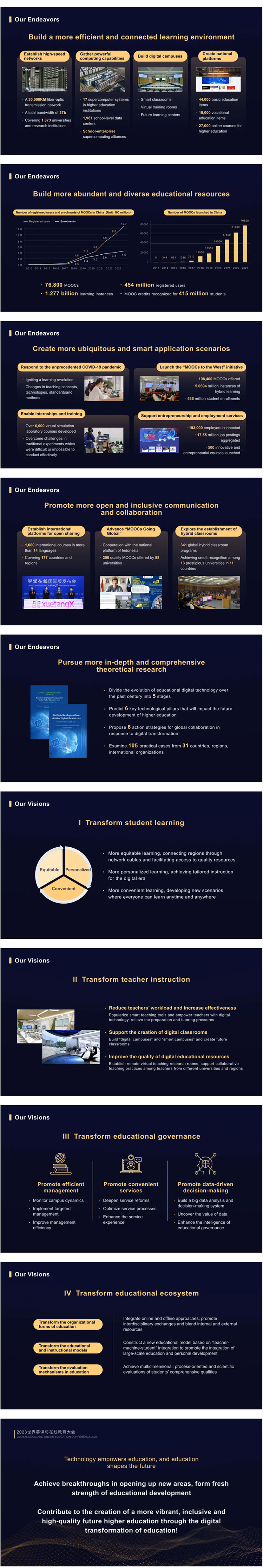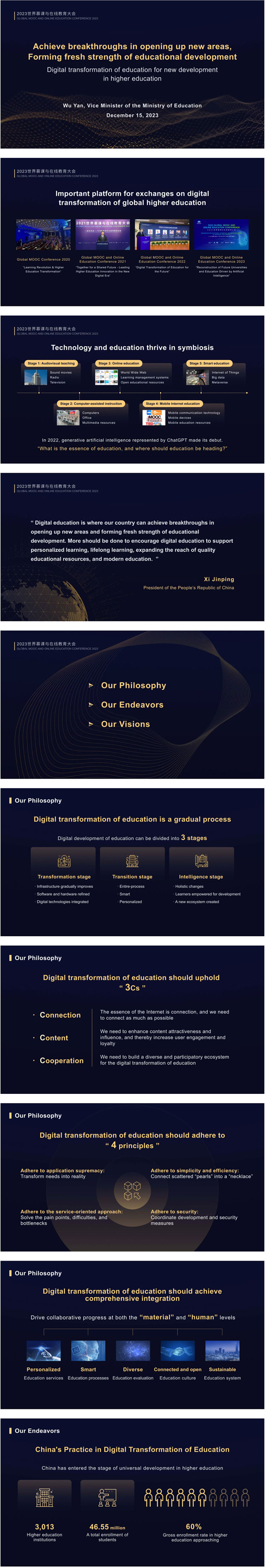 2023年12月15日,教育部副部长吴岩出席世界慕课与在线教育大会,并作题为《开辟新赛道,寻求新突破——教育数字化引领高等教育新发展》的主旨报告(英文原标题为:achieve breakthroughs in opening up new areas, forming fresh strength of educational development —— digital transformation of education for new development in higher education)。以下为ppt全文。