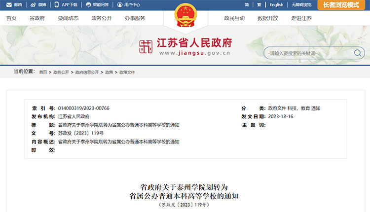 12月25日,江苏省人民政府网站发布《关于泰州学院划转为省属公办普通本科高等学校的通知》(简称《通知》)。经研究,决定将泰州学院划转为省属公办普通本科高等学校,主管部门为省教育厅。省各有关部门和泰州市要妥善做好划转期间资产处置、经费投入、人员编制、社保衔接、社会稳定及组织实施等各项工作,指导学校完善发展规划、强化内涵建设、健全治理体系,更好地服务区域经济社会高质量发展。