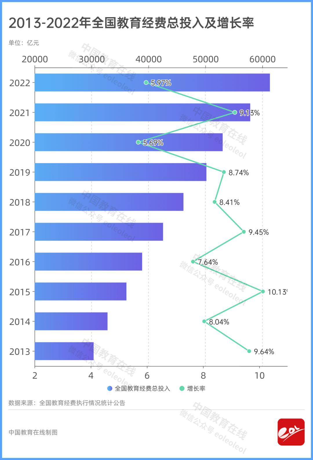 2023年12月,教育部、国家统计局、财政部发布《2022年全国教育经费执行情况统计公告》,公告显示:全国教育经费总投入为61329.14亿元,首次超过6万亿元,比上年增长5.97%。