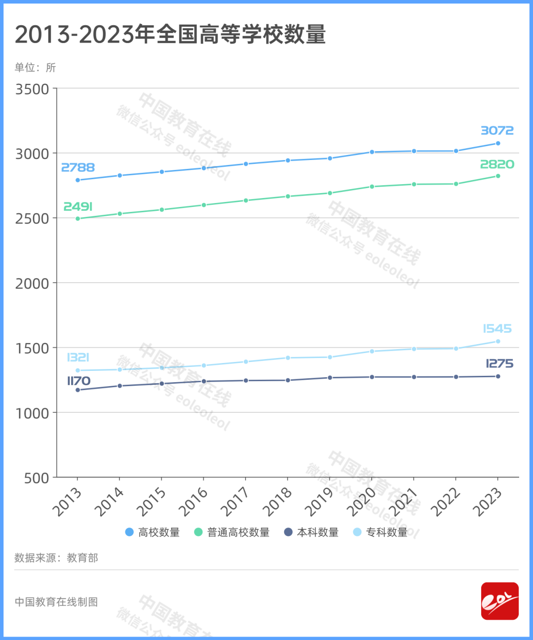 据教育部网站,截至2023年6月15日,全国高等学校共计3072所,其中:普通高等学校2820所,含本科院校1275所、高职(专科)院校1545所;成人高等学校252所。