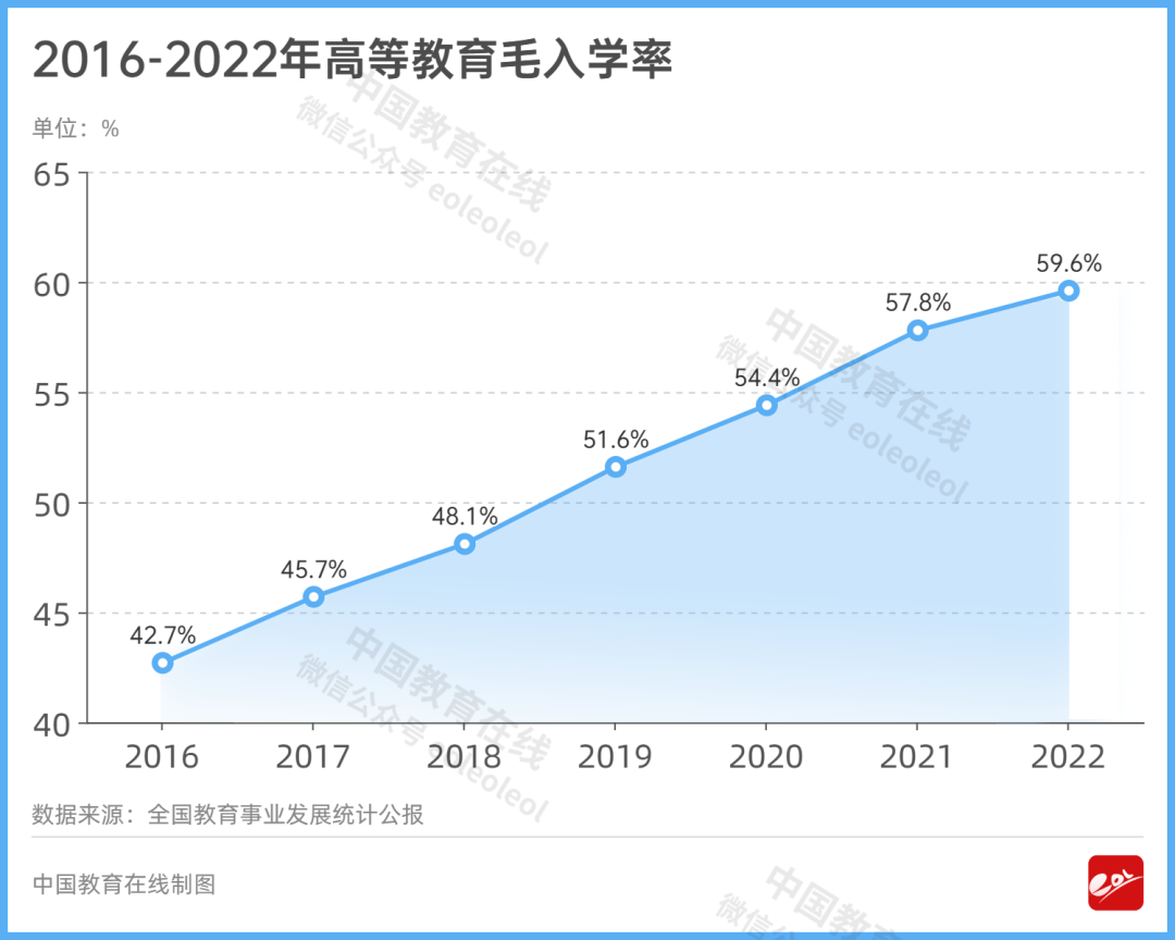 2023年3月,教育部发布《2022年全国教育事业发展统计公报》。公报显示,2022年高等教育毛入学率59.6%,比上年提高1.8个百分点。