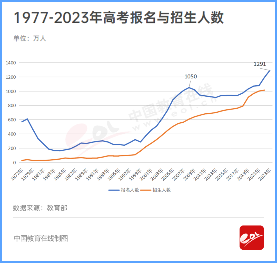 6月,教育部公布2023年全国高考报名人数为1291万人,较去年增加98万人,再创历史新高。