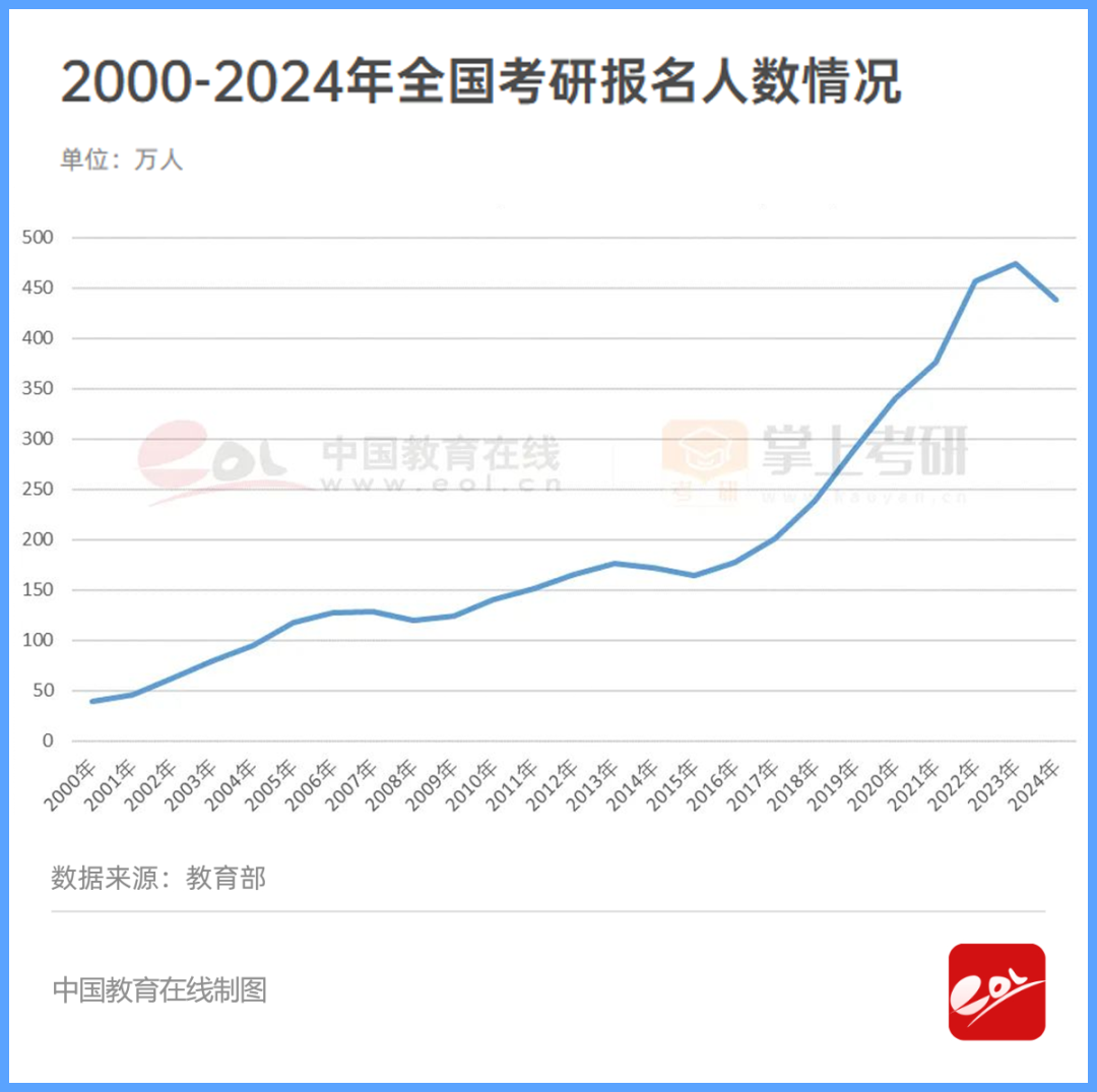 据教育部公布,2024年全国硕士研究生招生考试报名人数为438万,这是研究生报名人数在连续上涨8年后出现首次下降,比上年减少36万人。