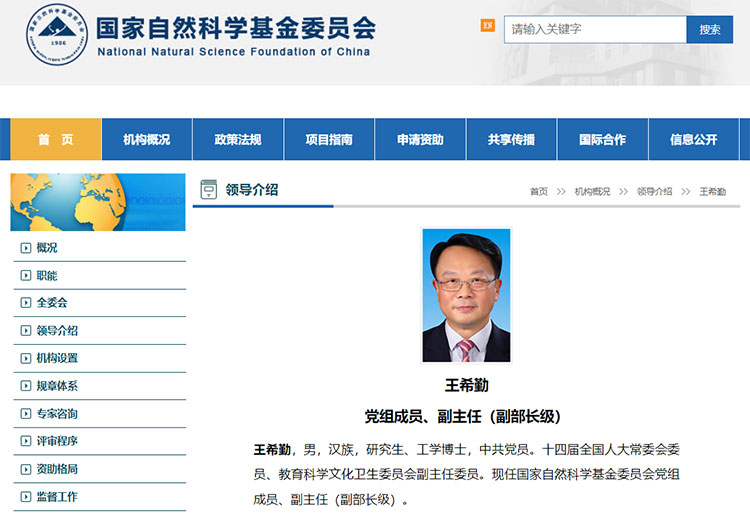 国家自然科学基金委员会网站“领导介绍”一栏最新信息显示,王希勤现任国家自然科学基金委员会党组成员、副主任(副部长级)。