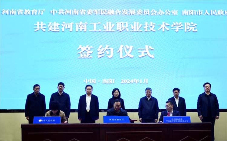1月16日,河南省教育厅、省委军民融合办与南阳市政府举行共建河南工业职业技术学院签约仪式。河南省委教育工委副书记,省教育厅党组书记、厅长毛杰,省委军民融合办常务副主任唐远游,南阳市委书记朱是西、市长王智慧出席。省委教育工委专职委员何秀敏、省委军民融合发展委员会办公室副主任孙岗,南阳市副市长阿颖共同签署《共建河南工业职业技术学院协议》。