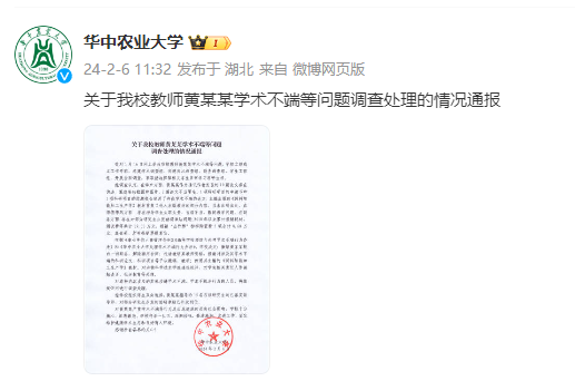 2月6日,华中农业大学通报教师黄某某学术不端等问题调查处理情况。具体如下: