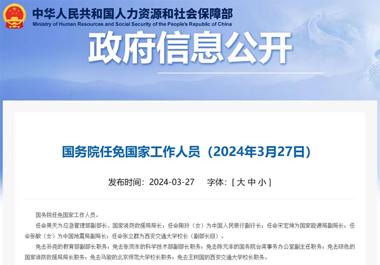 任命周天为应急管理部副部长、国家消防救援局局长;任命陶玲(女)为中国人民银行副行长;任命宋宏坤为国家能源局副局长;任命张敏(女)为中国地震局副局长;任命张立群为西安交通大学校长(副部长级)。