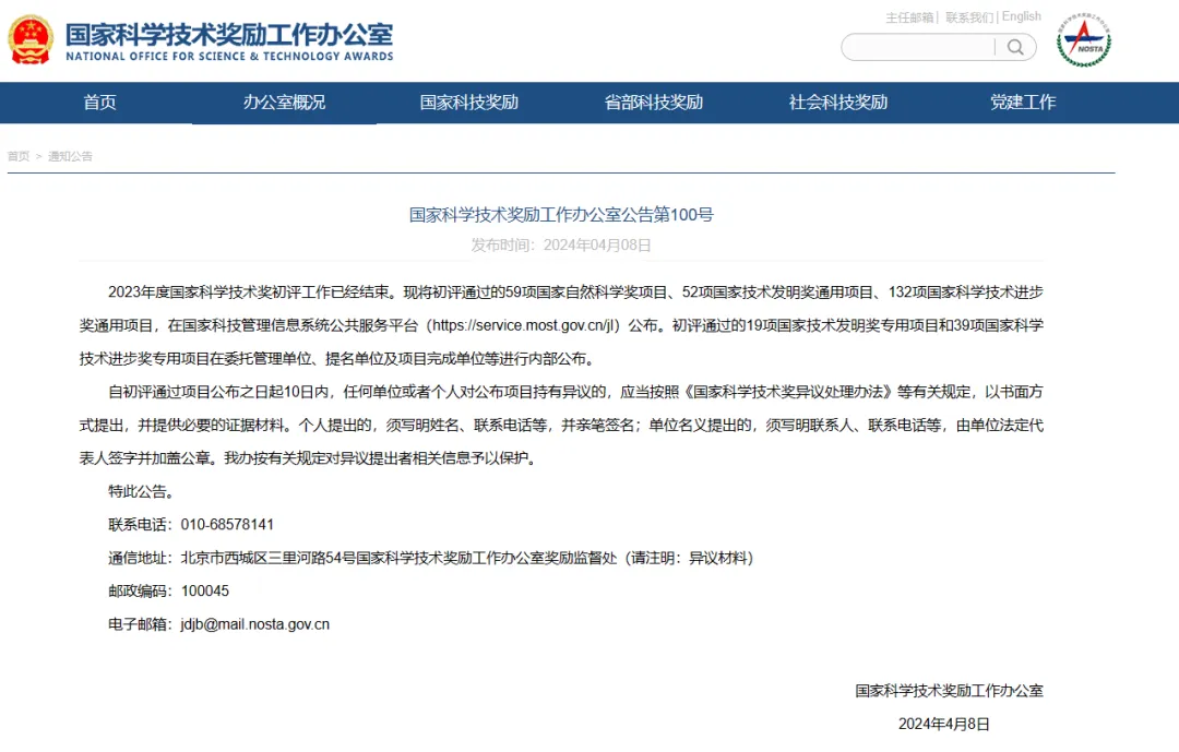 4月8日 ,国家科学技术奖励工作办公室公布2023年度国家科学技术奖初评结果。
