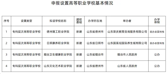 近日,山东省教育厅网站发布《关于申报设置高等职业学校的公示》,其中提到拟设置德州理工职业学院、日照康养职业学院、烟台卫生健康职业学院、山东文化艺术职业学院4所高等职业学校。以下为公示原文——