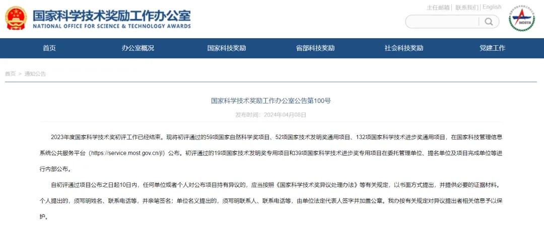2023年度国家科学技术奖初评工作已经结束。现将初评通过的59项国家自然科学奖项目、52项国家技术发明奖通用项目、132项国家科学技术进步奖通用项目,在国家科技管理信息系统公共服务平台(https://service.most.gov.cn/jl)公布。初评通过的19项国家技术发明奖专用项目和39项国家科学技术进步奖专用项目在委托管理单位、提名单位及项目完成单位等进行内部公布。