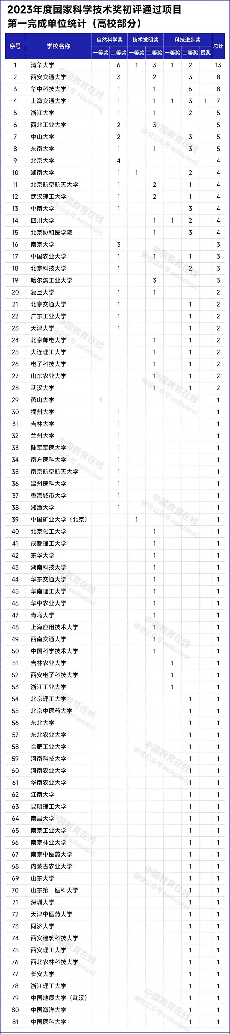 据统计,在通过初评的通用项目中,以高校为第一完成单位的项目共计167项。其中,清华大学以13项的获评总数位居第一;西安交通大学和华中科技大学紧随其后,各获评8项。