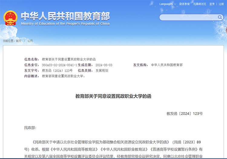 日前,教育部网站公开《教育部关于同意设置民政职业大学的函》,同意以北京社会管理职业学院为基础设立民政职业大学,学校标识码为4111014139;同时撤销北京社会管理职业学院的建制。