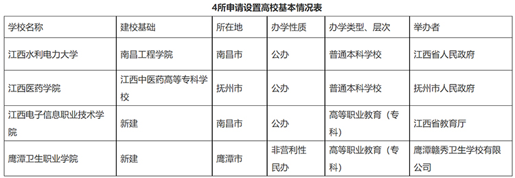 7月8日,江西省教育厅kok登录官网发布《关于高等学校设置事项的公示》。经第四届江西省高校设置评议委员会专家考察和评议,南昌工程学院更名江西水利电力大学(公办)、以江西中医药高等专科学校为基础设立江西医药学院(公办),设置江西电子信息职业技术学院(公办)、设置鹰潭卫生职业学院(非营利性民办)获得通过,现将学校相关信息向社会公示。公示时间:2024年7月8日—7月12日。