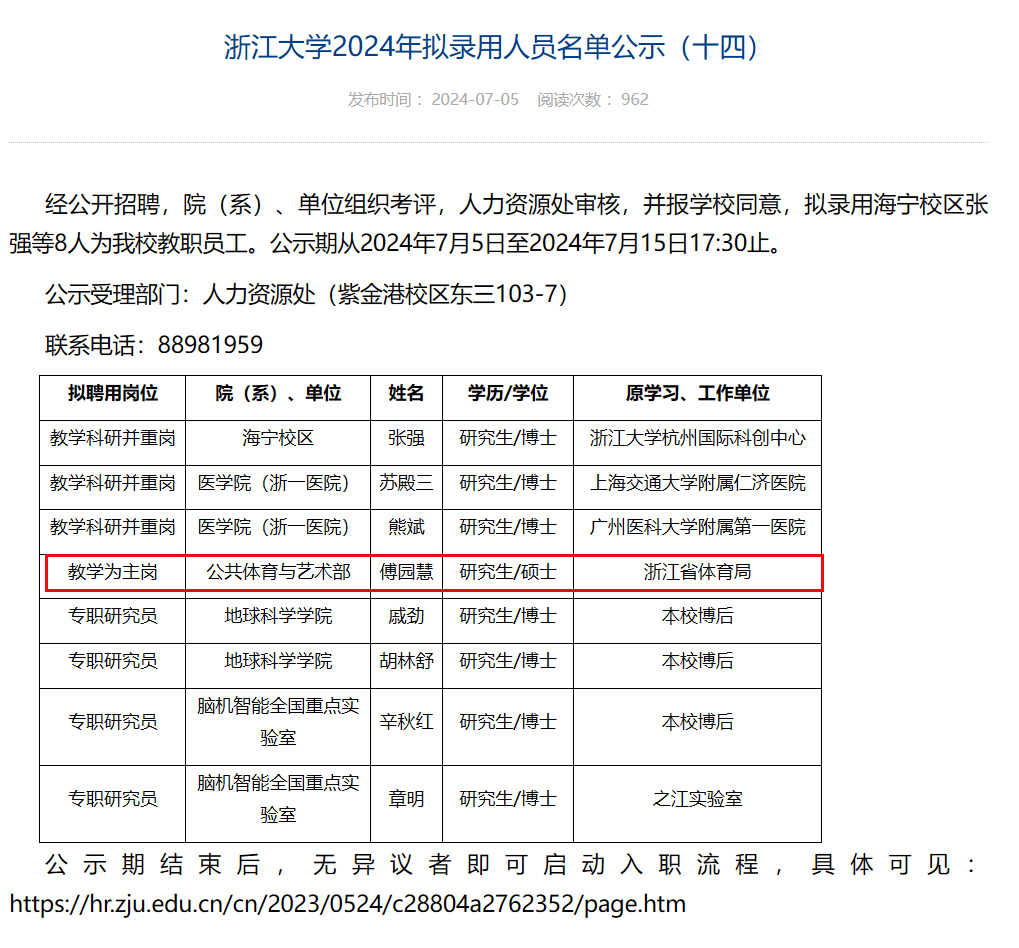 近日,浙江大学公示2024年拟录用人员名单。其中,世界冠军傅园慧拟聘用岗位为公共体育与艺术部教学岗。