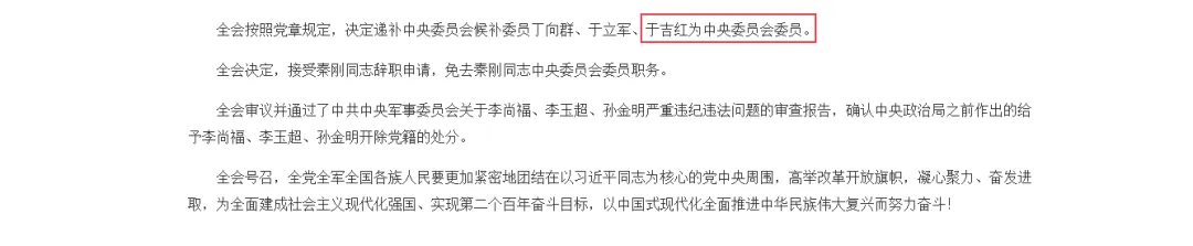 7月18日,据新华社消息,中国共产党第二十届中央委员会第三次全体会议按照党章规定,决定递补中央委员会候补委员丁向群、于立军、于吉红为中央委员会委员。