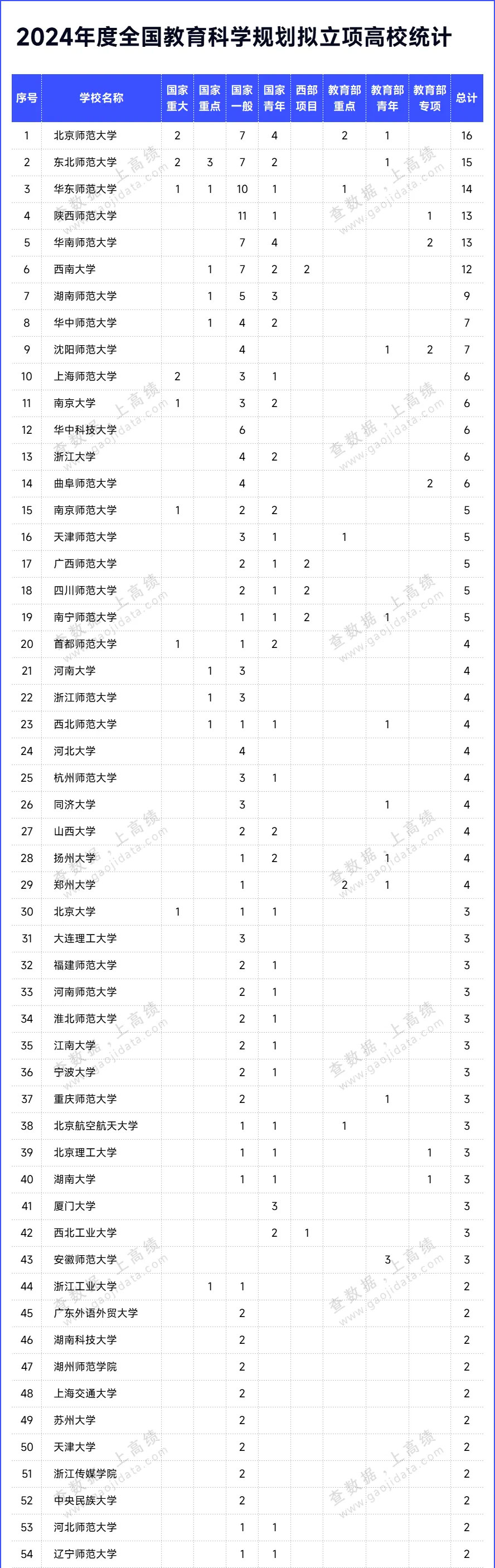 据统计,此次全国教育科学规划2024年度课题拟立项名单中,高校共407项课题拟获立项资助。拟立项课题最多的是北京师范大学,拟立项16个课题。其次是东北师范大学和华东师范大学,分别拟立项15个和14个课题。