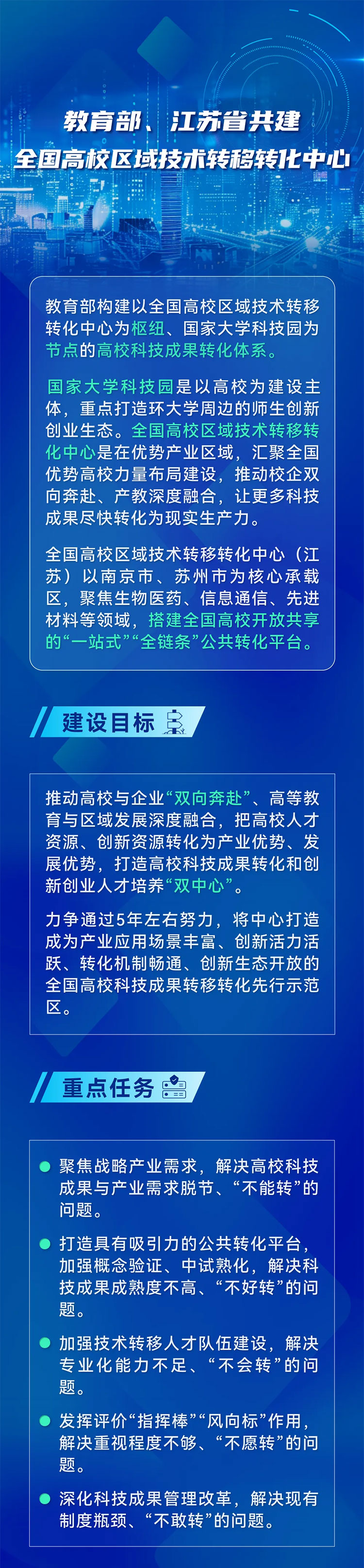 刚刚闭幕的全国教育大会对高校科技成果转化作出重要部署,强调让更多科技成果尽快转化为现实生产力。9月14日,一项落实全国教育大会精神,剑指高校科技成果转化关键难题的重大举措落地——教育部、江苏省共建首个全国高校区域技术转移转化中心(以下简称“区域中心”),拉开新时期推进高校科技成果转化的序幕。一起来看一图解读——