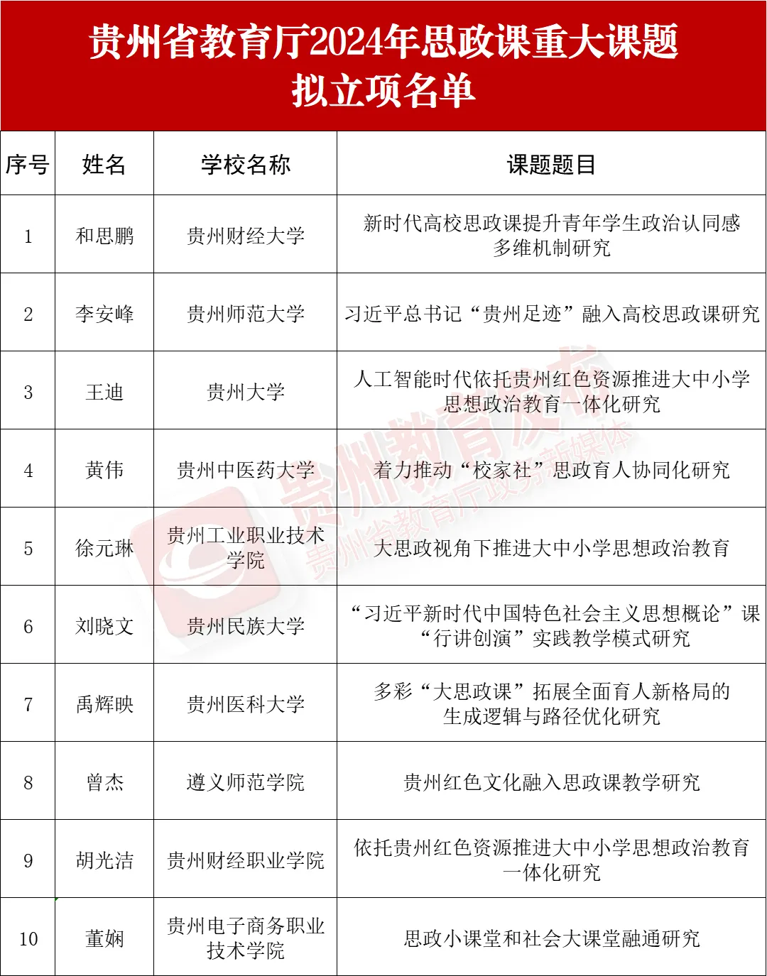 公示!贵州省教育厅2024年思政课重大课题拟立项名单