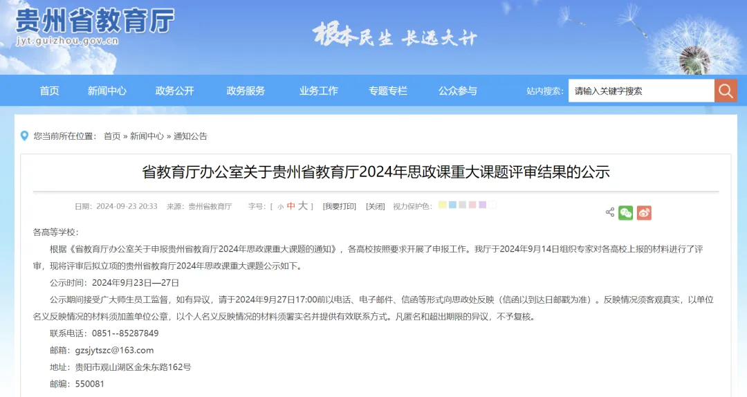 近日,贵州省教育厅组织专家对各高校上报的2024年思政课重大课题材料进行了评审,现将评审结果予以公示。公示时间为2024年9月23日—27日。