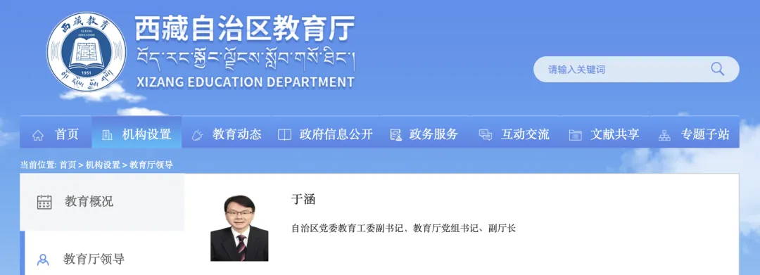 西藏自治区教育厅网站日前更新后显示,于涵已任自治区党委教育工委副书记,教育厅党组书记、副厅长。