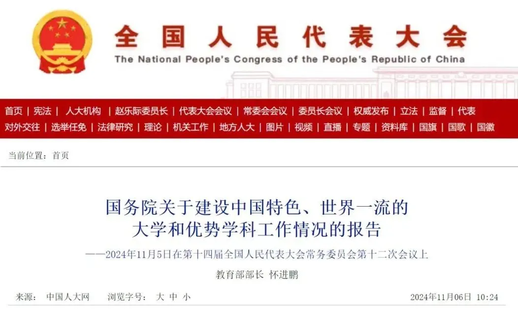 我受国务院委托,向全国人大常委会报告建设中国特色、世界一流的大学和优势学科工作情况,请审议。