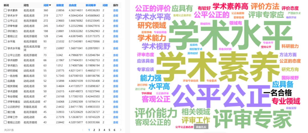 调查发现,在高质量评审专家应该具备的素质和条件问题中,“学术素养 学术水平”、“公平公正 客观公正”、“评审专家 评价能力”是评审专家主张最多的高频词汇,是最重要的素质和标准。