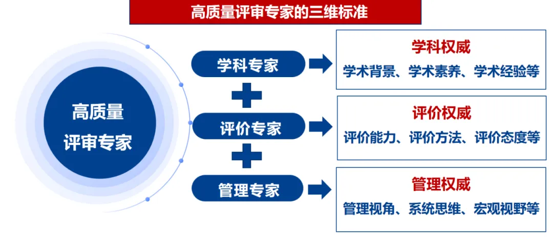 经过课题组对专家们问卷的综合分析和归纳总结,报告提出,高质量的评审专家必须同时具备“学科专家”“评价专家”“管理专家”三个维度的能力和素质。