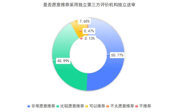 对于“独立的第三方评价机构”在评审过程的保密性和公平性表现、与评审对象学术背景的匹配度以及评审工作的效率和流程方面,评审专家的满意度均超98%。总体来看,评审专家对独立第三方评价机构整体评审服务满意度很高。在被问及是否愿意推荐其他用人单位采用独立第三方评价机构独立送审服务时,超99%的评审专家表示愿意或可以推荐。