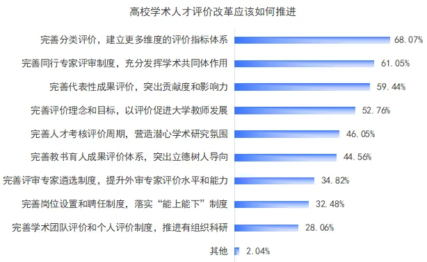 课题组专家,对外经济贸易大学教育与开放经济研究中心秦冠英副研究员介绍,调查报告还针对当前人才发展与评价的热点问题进行了调研,发现“人才评价标准单一”、“重科研、轻教学”仍是评价改革的主要问题;推进人才评价改革应当主要推进分类评价和同行专家评审;考核留任是高校青年教师发展面临的主要问题;提高薪酬待遇和改革职称评价体系是高校青年教师发展的主要诉求;专家显著倾向于学校根据实际情况决定是否采用“非升即走”制度;专家倾向于通过多种途径推进国际引才。