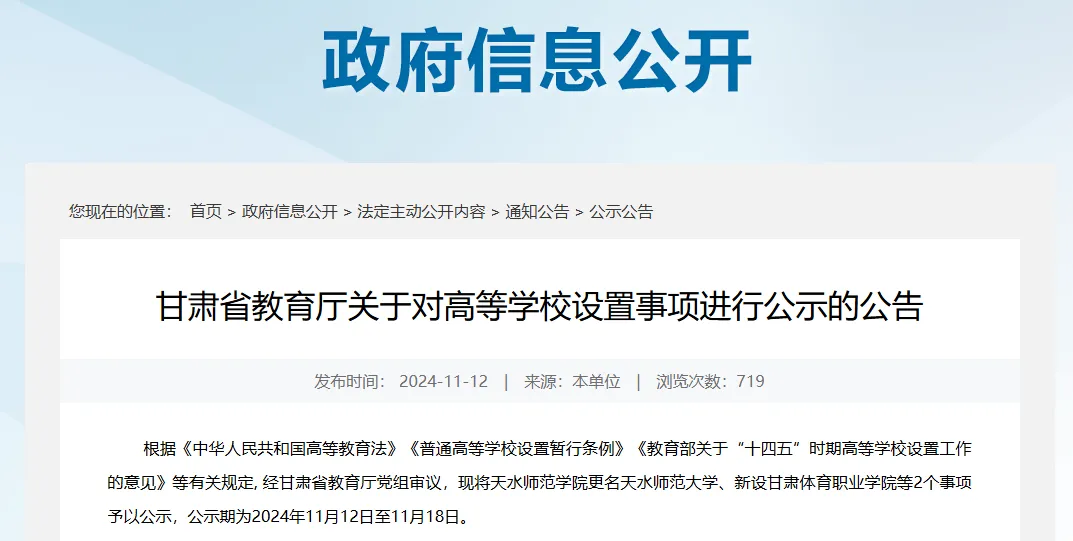 11月12日,甘肃省教育厅发布关于对高等学校设置事项进行公示的公告。根据《中华人民共和国高等教育法》《普通高等学校设置暂行条例》《教育部关于“十四五”时期高等学校设置工作的意见》等有关规定, 经甘肃省教育厅党组审议,现将天水师范学院更名天水师范大学、新设甘肃体育职业学院等2个事项予以公示,公示期为2024年11月12日至11月18日。