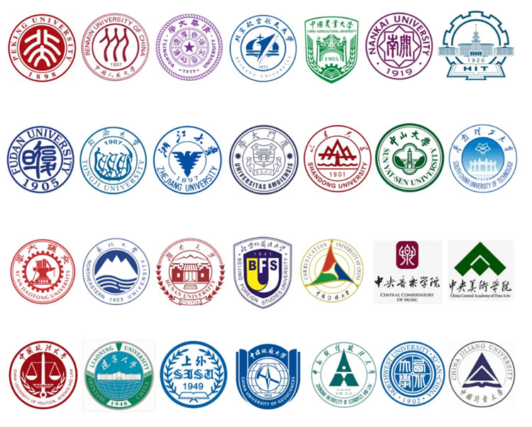 北京大学、中国人民大学、清华大学、北京航空航天大学、中国农业大学、南开大学、哈尔滨工业大学、复旦大学、同济大学、浙江大学、厦门大学、山东大学、中山大学、华南理工大学、西安交通大学、东北大学、湖南大学、北京外国语大学、中国传媒大学、中央音乐学院、中央美术学院、中国政法大学、辽宁大学、上海外国语大学、中国地质大学(北京)、中南财经政法大学、西北大学、中国计量大学