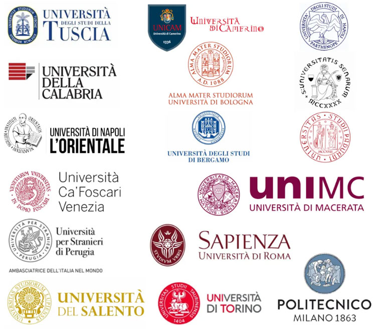 巴里lum大学、巴里理工大学、贝加莫大学、博洛尼亚大学、都灵大学、都灵理工大学、卡拉布里亚大学、卡梅里诺大学、罗马link校园大学、罗马国际研究大学、罗马第一大学、马切拉塔大学、米兰理工大学、那不勒斯东方大学、那不勒斯费德里科二世大学、那不勒斯“帕特诺普”大学、佩鲁贾外国人大学、帕多瓦大学、萨伦托大学、图西亚大学、威尼斯大学、锡耶纳大学