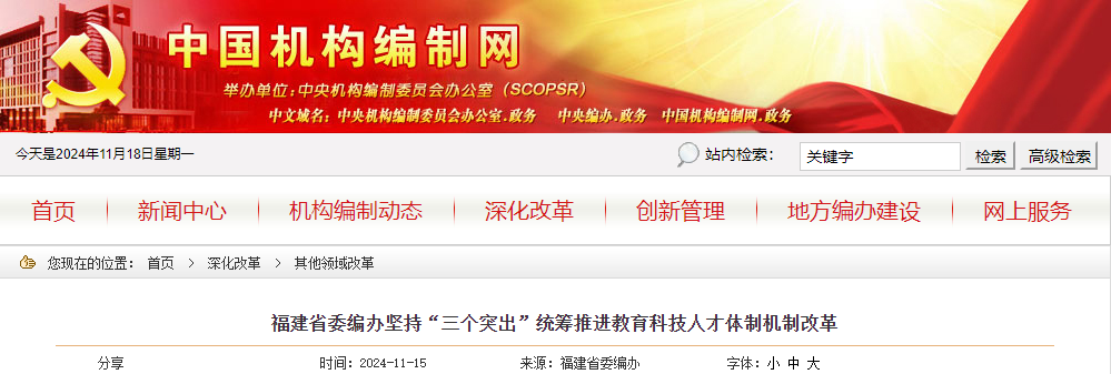 近年来,福建省委编办深入贯彻落实科教兴省战略、人才强省战略、创新驱动发展战略,坚持“三个突出”,统筹部署教育科技人才体制机制改革,为提升创新体系整体效能提供保障。