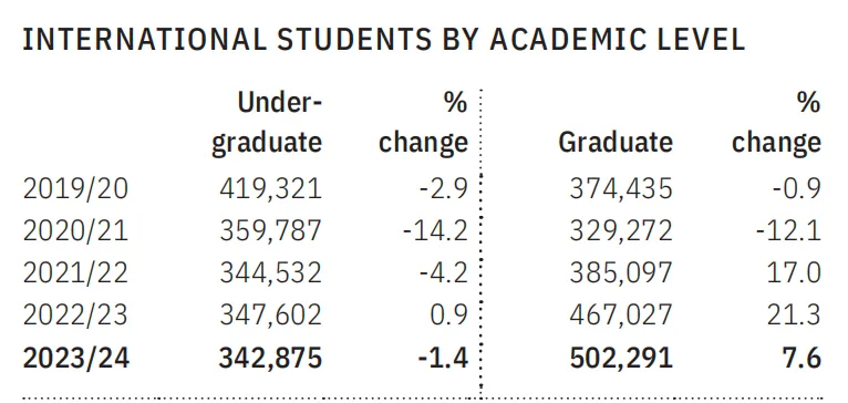 在学术层次方面,本科留学生人数为342,875人,略有下降;而研究生人数则达到502,291人,同比增长7.6%,显示出越来越多国际学生倾向于赴美攻读研究生学位。