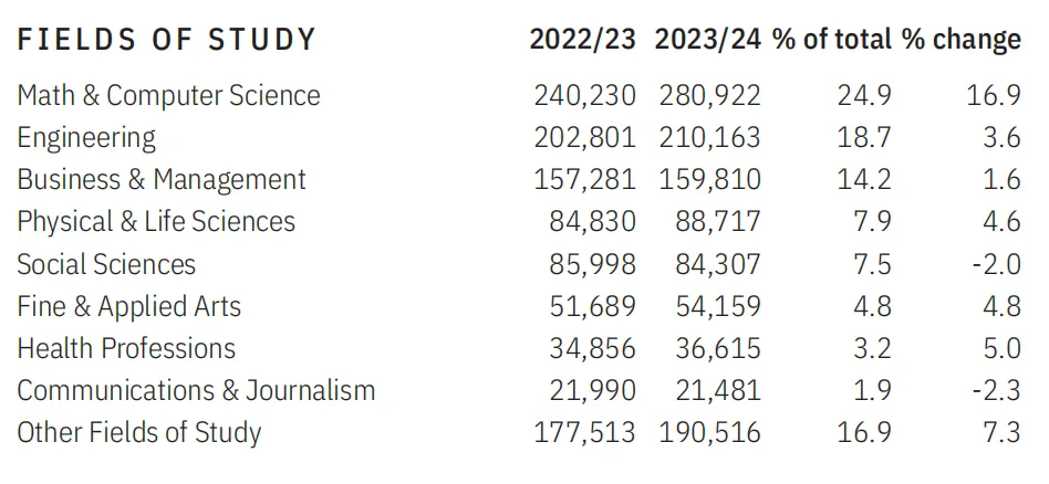 在专业选择方面,数学与计算机科学专业依旧是国际学生的首选,共有280,922人就读,其次是工程类专业,共计210,163人。商业与管理专业也广受欢迎,就读人数达到159,810人。stem领域的留学热度持续升温,占据了整体国际学生群体中的半壁江山。