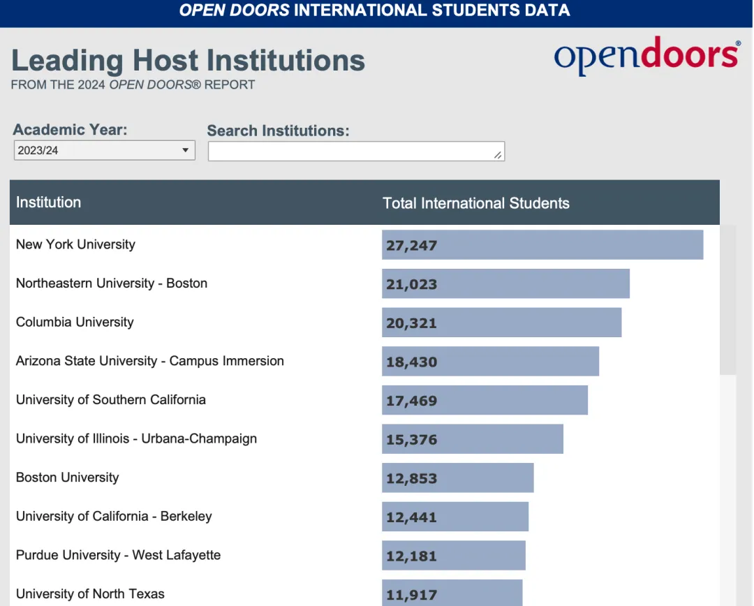 纽约大学以27,247名国际学生继续稳居榜首,成为最受欢迎的院校。紧随其后的是东北大学波士顿校区、哥伦比亚大学、亚利桑那州立大学和南加州大学等。