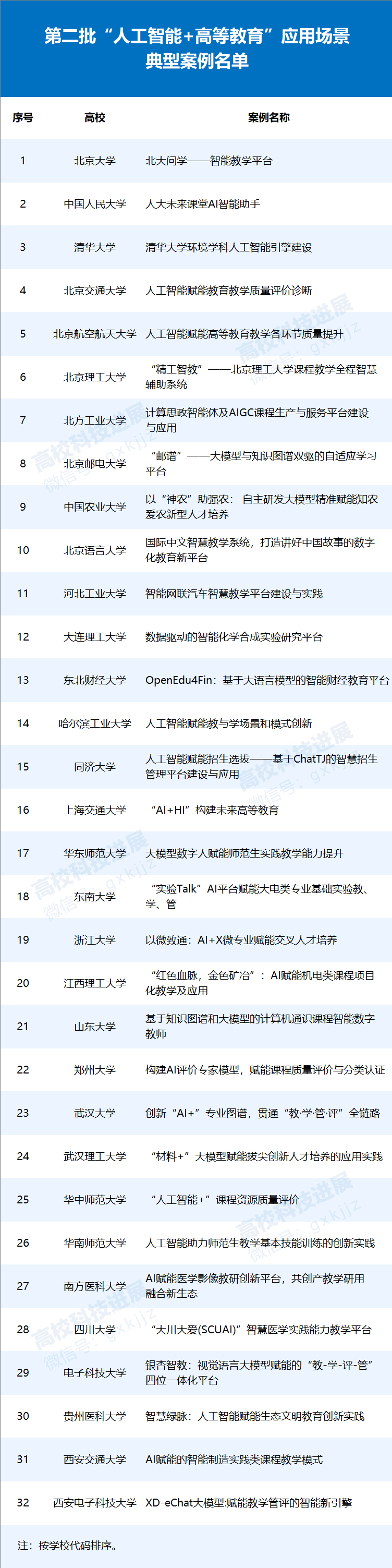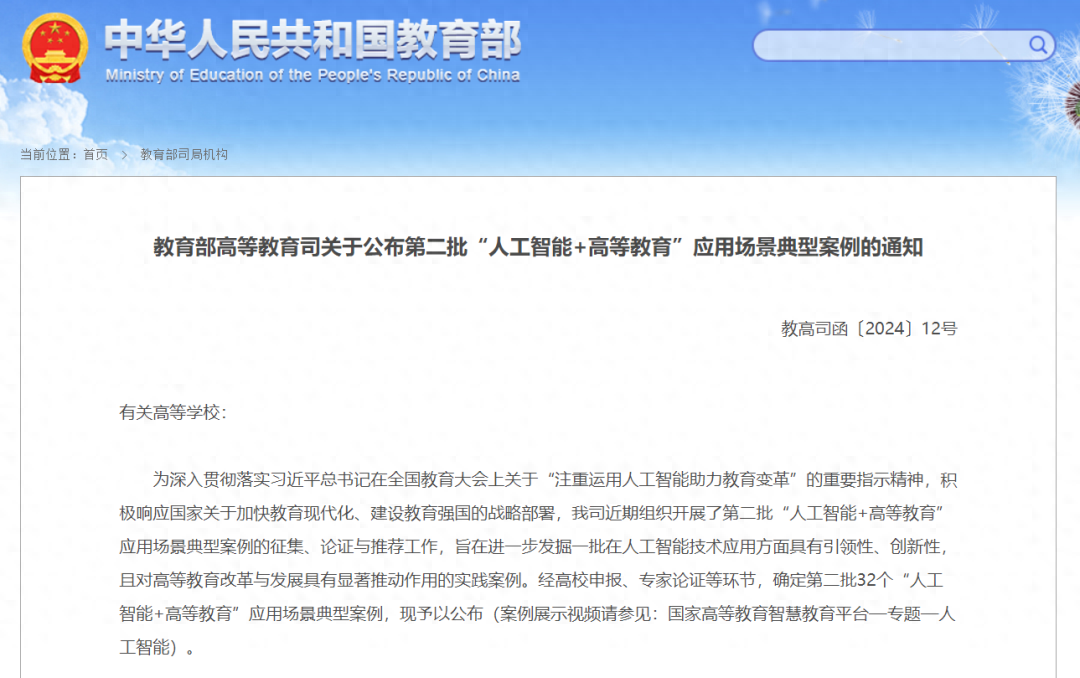 日前,教育部高等教育司发布《关于公布第二批“人工智能 高等教育”应用场景典型案例的通知》,经高校申报、专家论证等环节,确定第二批32个“人工智能 高等教育”应用场景典型案例。