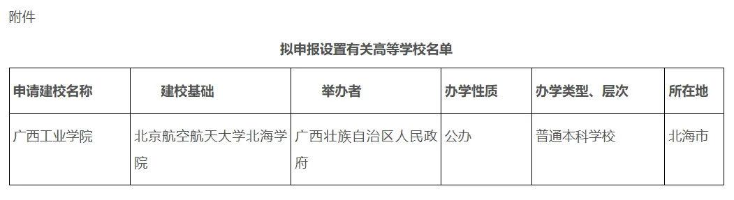 11月25日,广西壮族自治区教育厅发布《关于拟申报设置有关高等学校的公示》。根据《中华人民共和国高等教育法》《普通高等学校设置暂行条例》《普通本科学校设置暂行规定》《关于加快推进独立学院转设工作的实施方案》等有关规定,经广西壮族自治区高等学校设置评议委员会考察和评议,现将北京航空航天大学北海学院转设为广西工业学院事项予以公示。