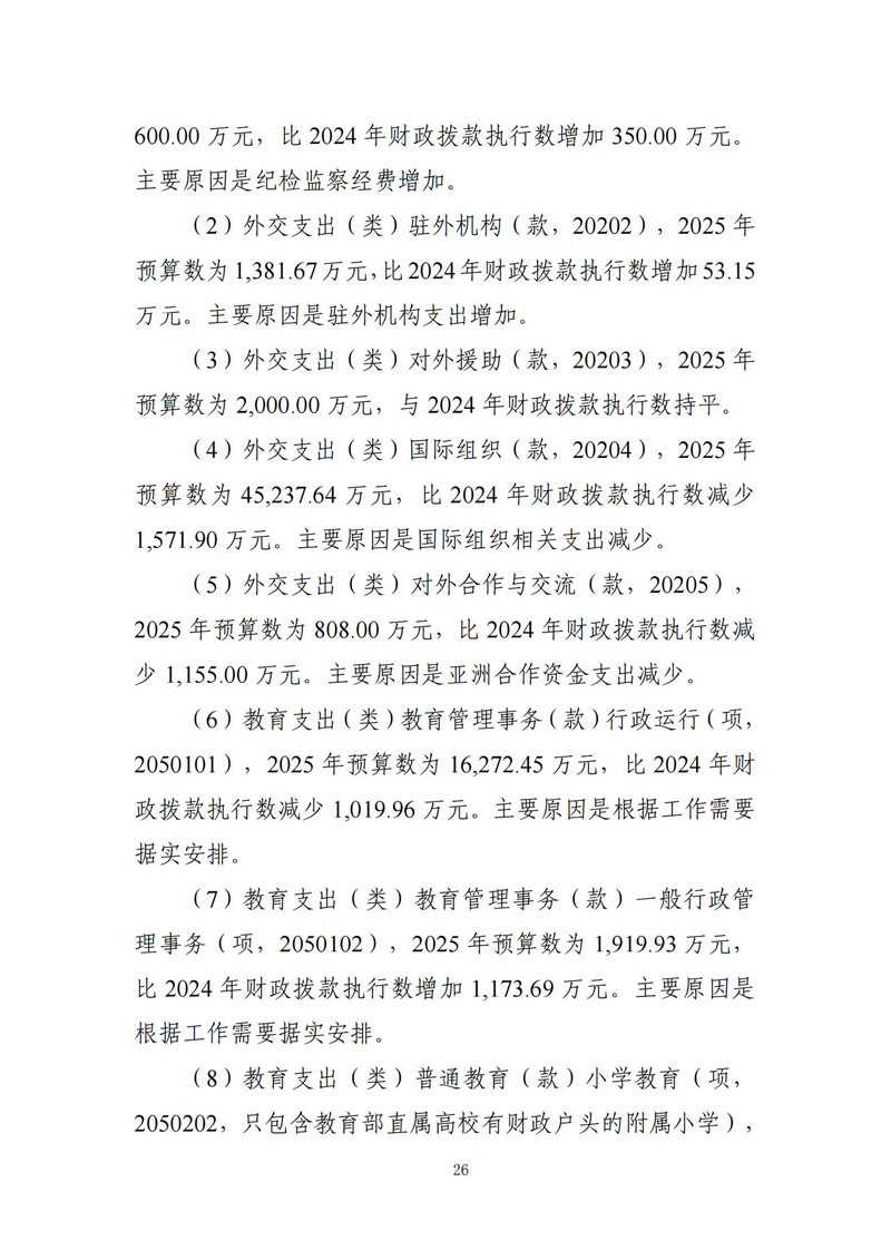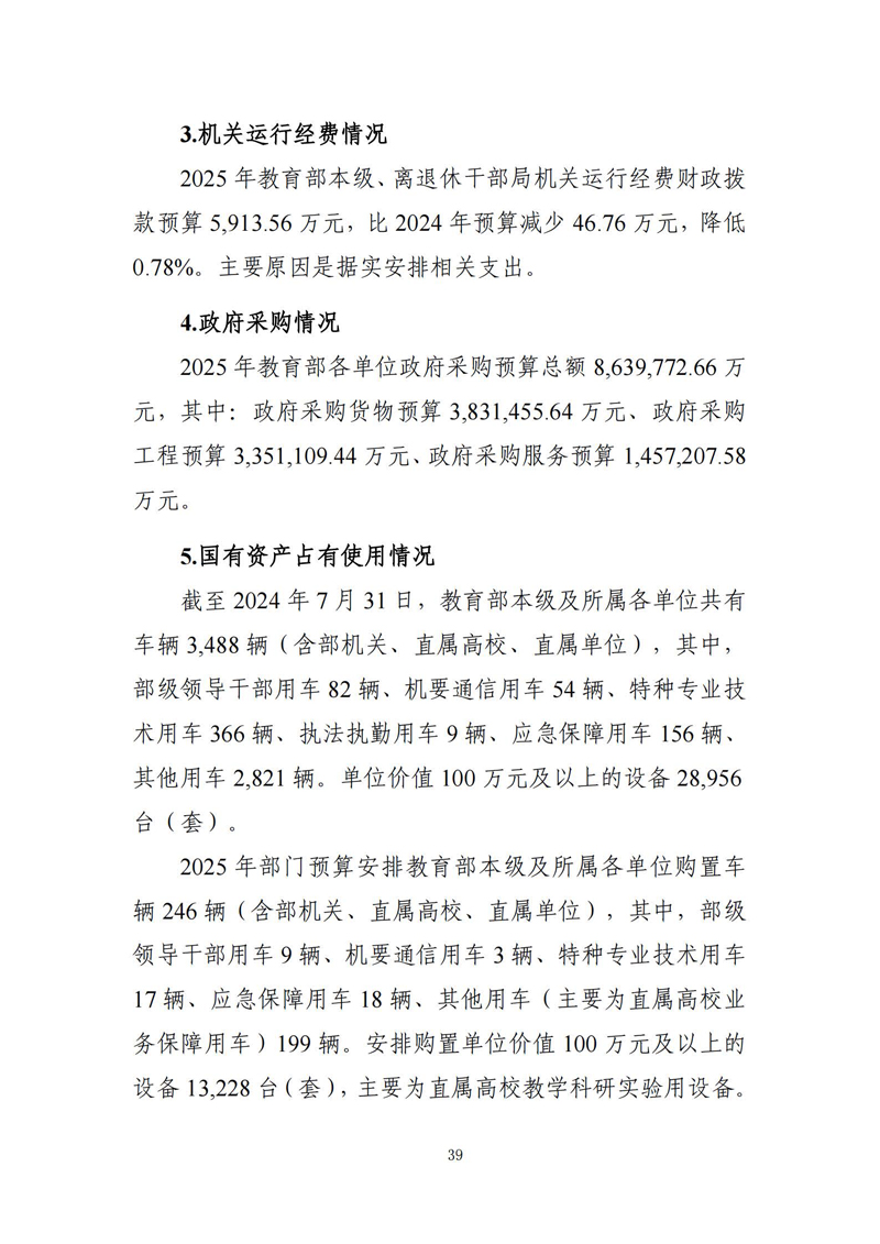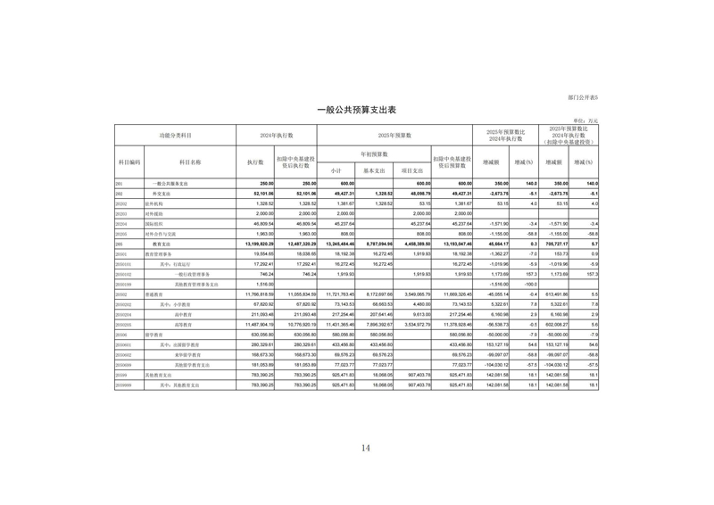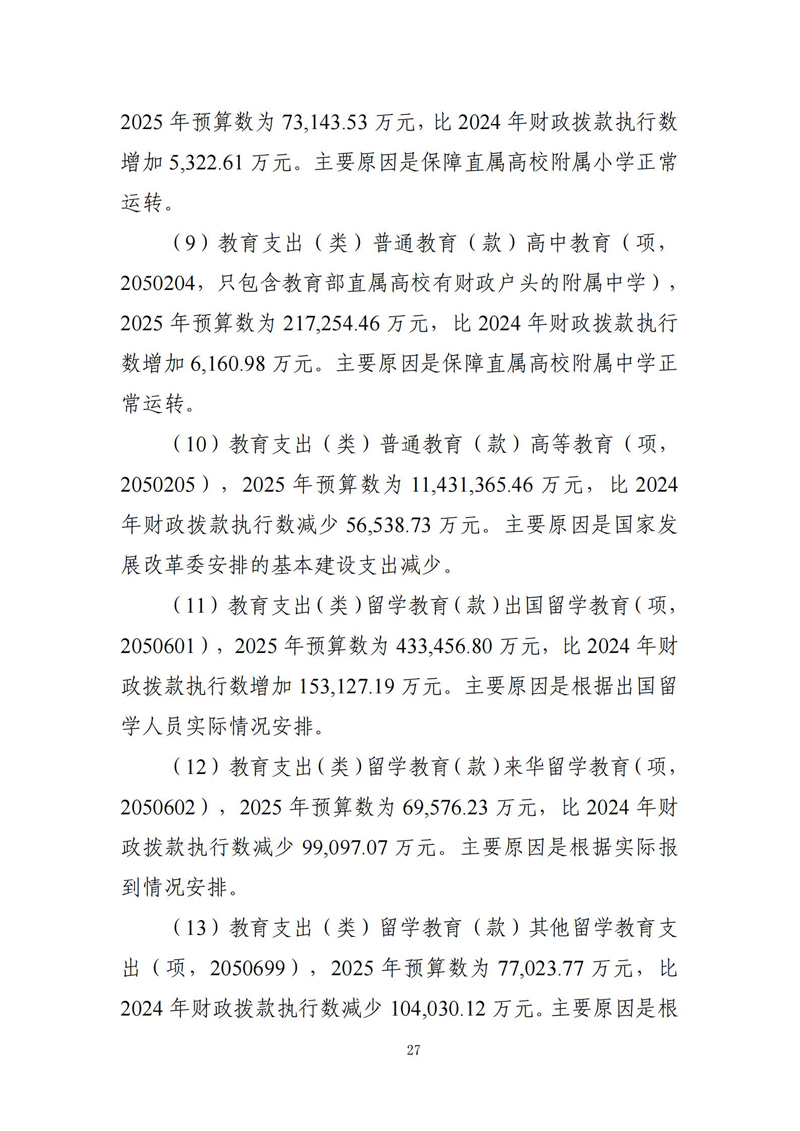 教育支出(类)普通教育(款)高等教育(项,2050205),2025年预算数为11,431,365.46万元,比2024年财政拨款执行数减少56,538.73万元。主要原因是国家发展改革委安排的基本建设支出减少。