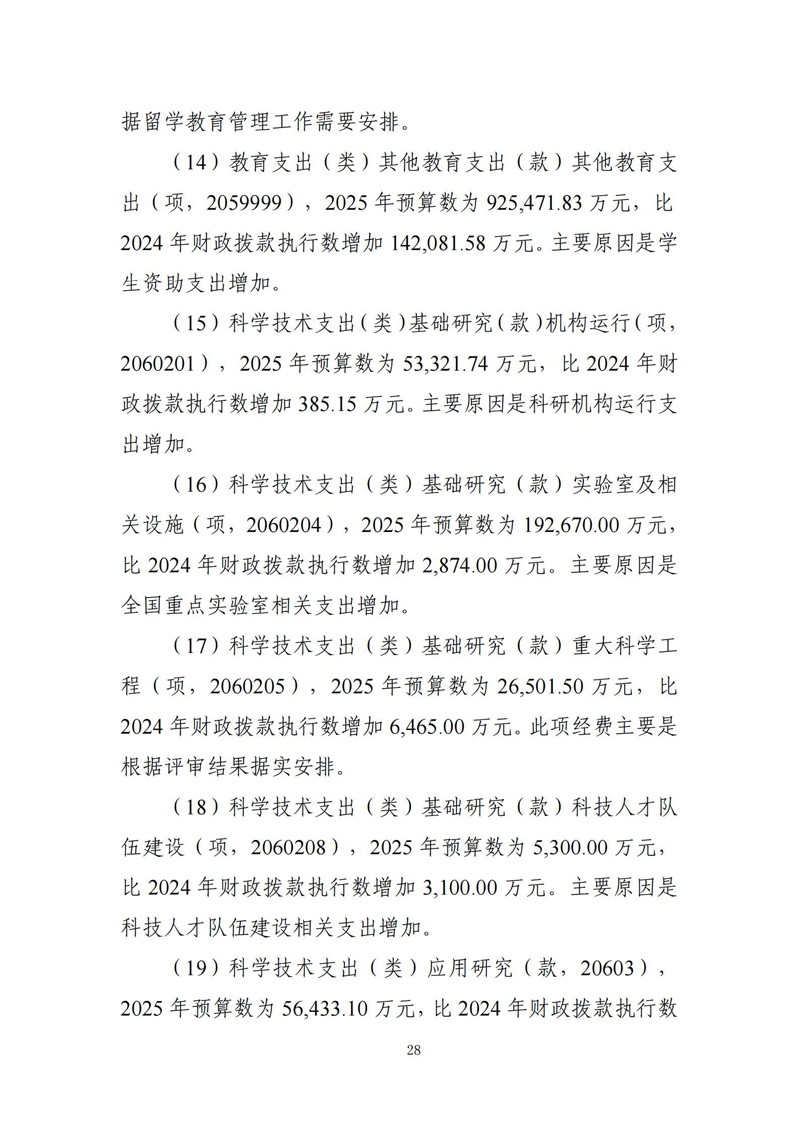 科学技术支出(类)基础研究(款)实验室及相关设施(项,2060204),2025年预算数为192,670.00万元, 比2024年财政拨款执行数增加2,874.00万元。主要原因是全国重点实验室相关支出增加。