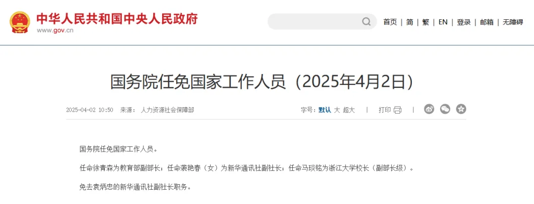 4月2日,国务院任免国家工作人员。