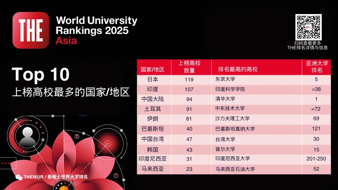 在2025 年泰晤士高等教育亚洲大学排名中,中国大陆高校独占鳌头,清华大学第七年蝉联第一,五所中国大陆高校进入前十名,上榜高校中有近三分之一的排名有所提升。