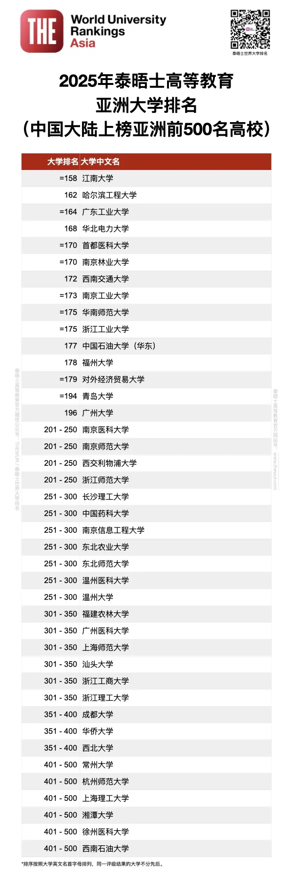 中国大陆共有94所高校上榜,是上榜高校数量排在第三国家/地区,仅次于日本(119所)和印度(107所)。中国大陆有25所高校创下了史上最佳表现,28所高校的排名较去年有所提升。